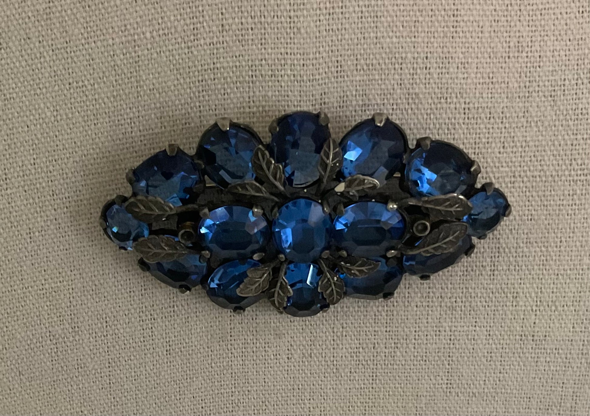 This 1940s vintage Czech crystal blue rhinestone brooch is a real stunner. Measuring 3" wide and 1 3/4" high, it adorned with delicate silver leaves and prong-set crystals.