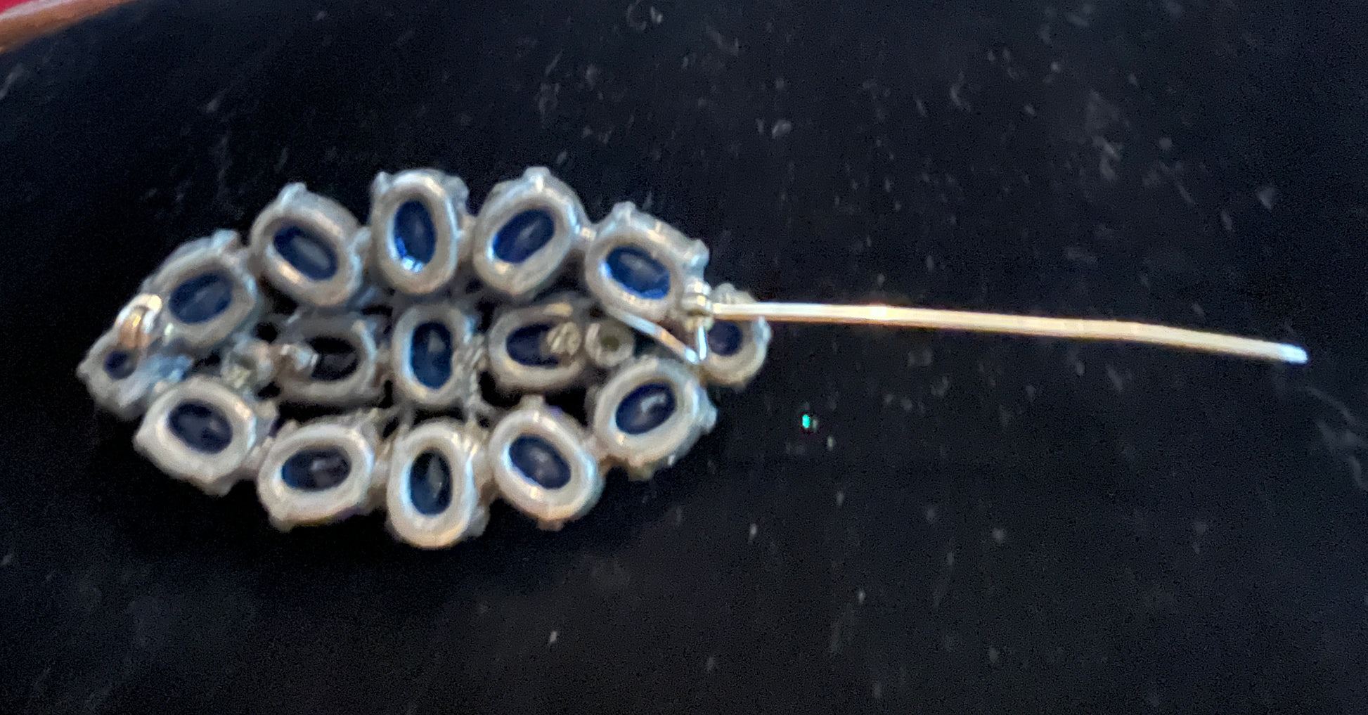 1940s Czech Blue Crystal & Silver Leaf Rhinestone Brooch