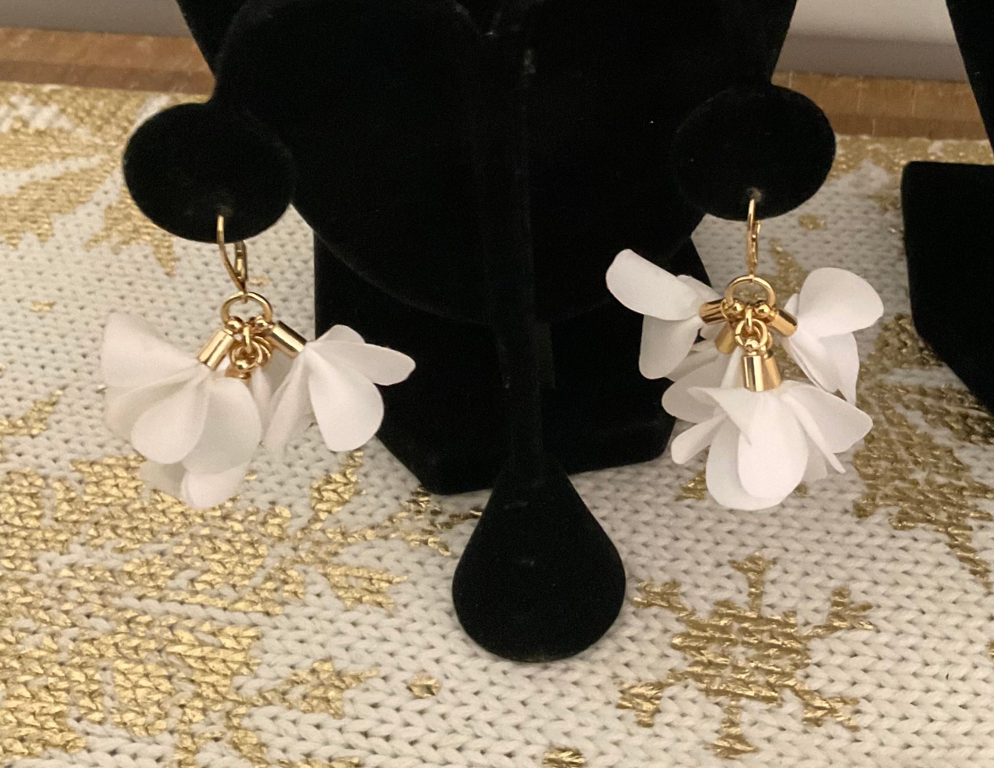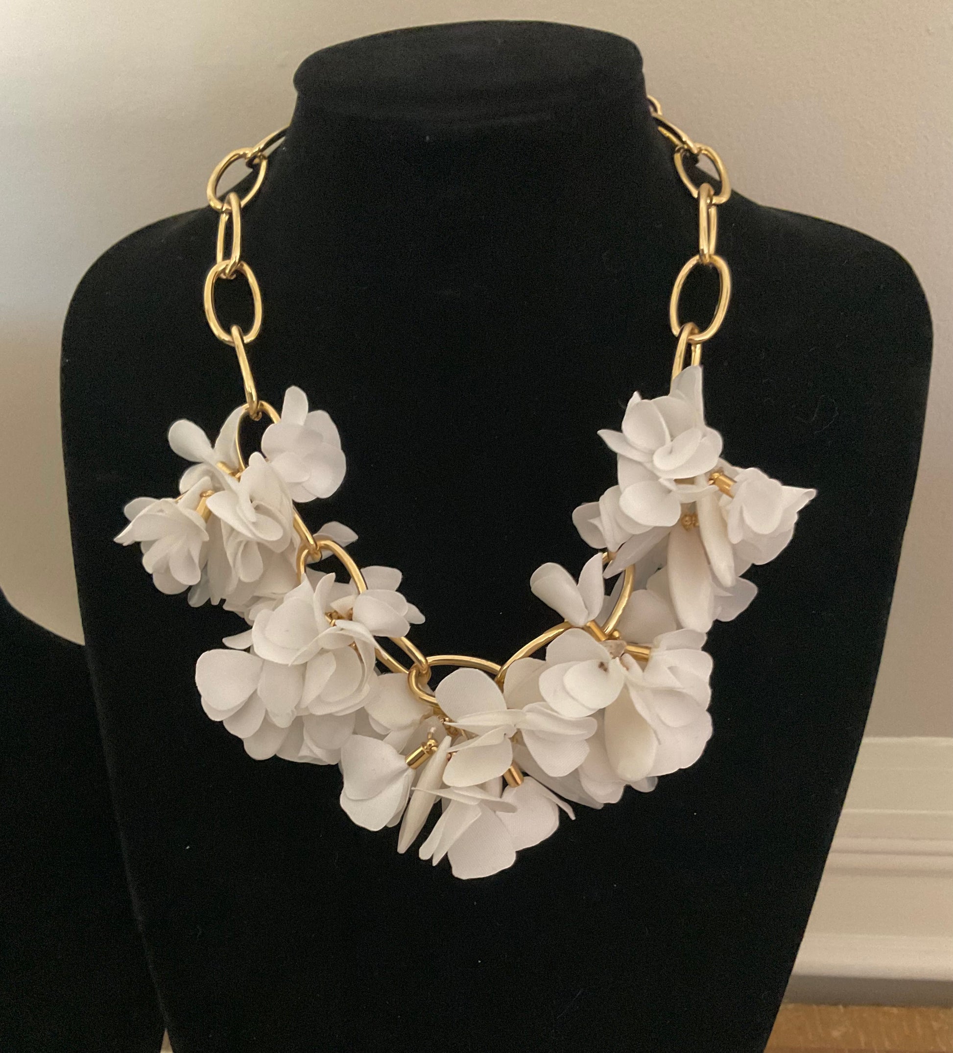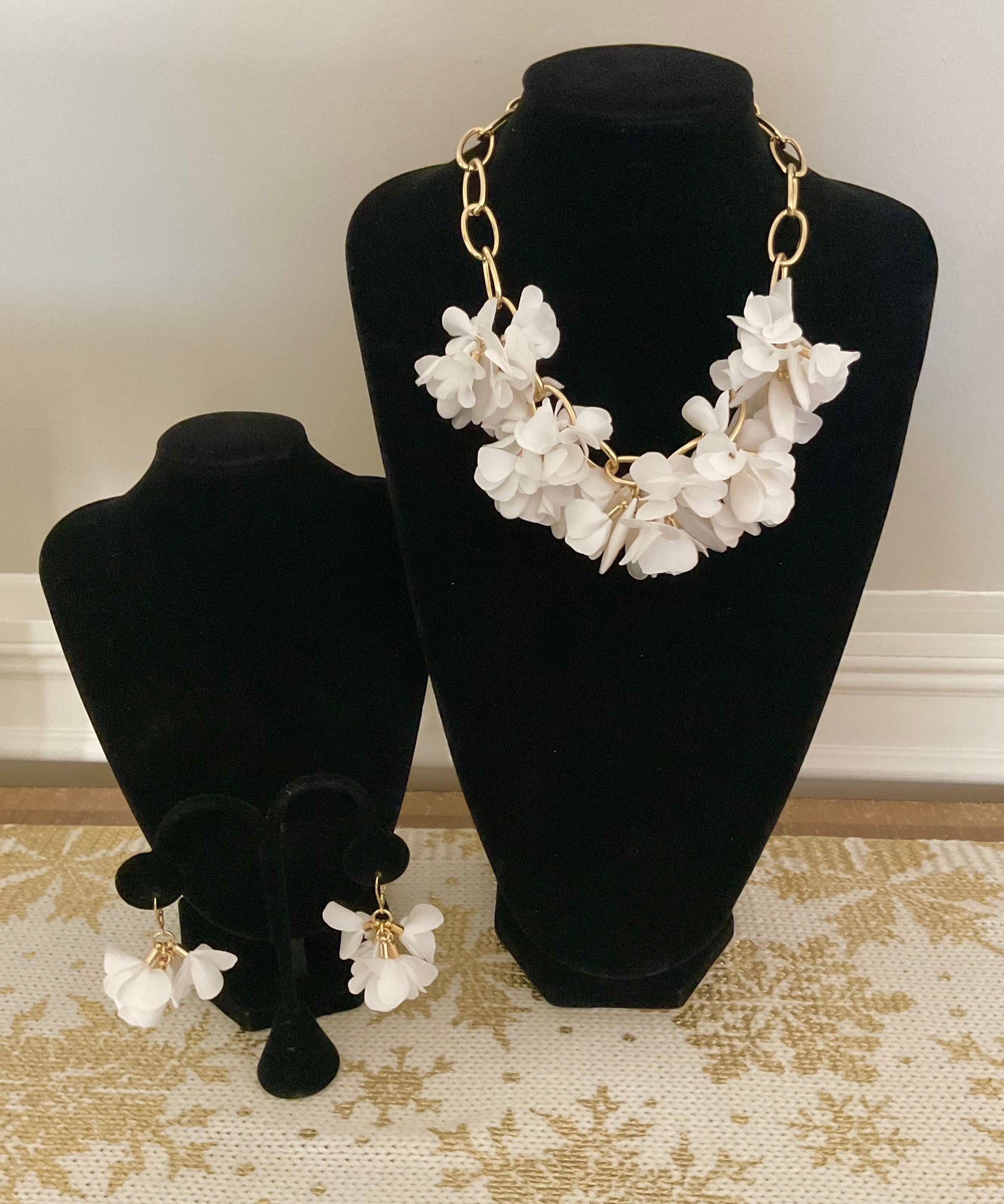 Hard to find, signed Talbots white flower necklace and matching earrings. Necklace measures 18”, with additional 3” extender. Earrings are pierced, with lever back closure. Excellent condition.