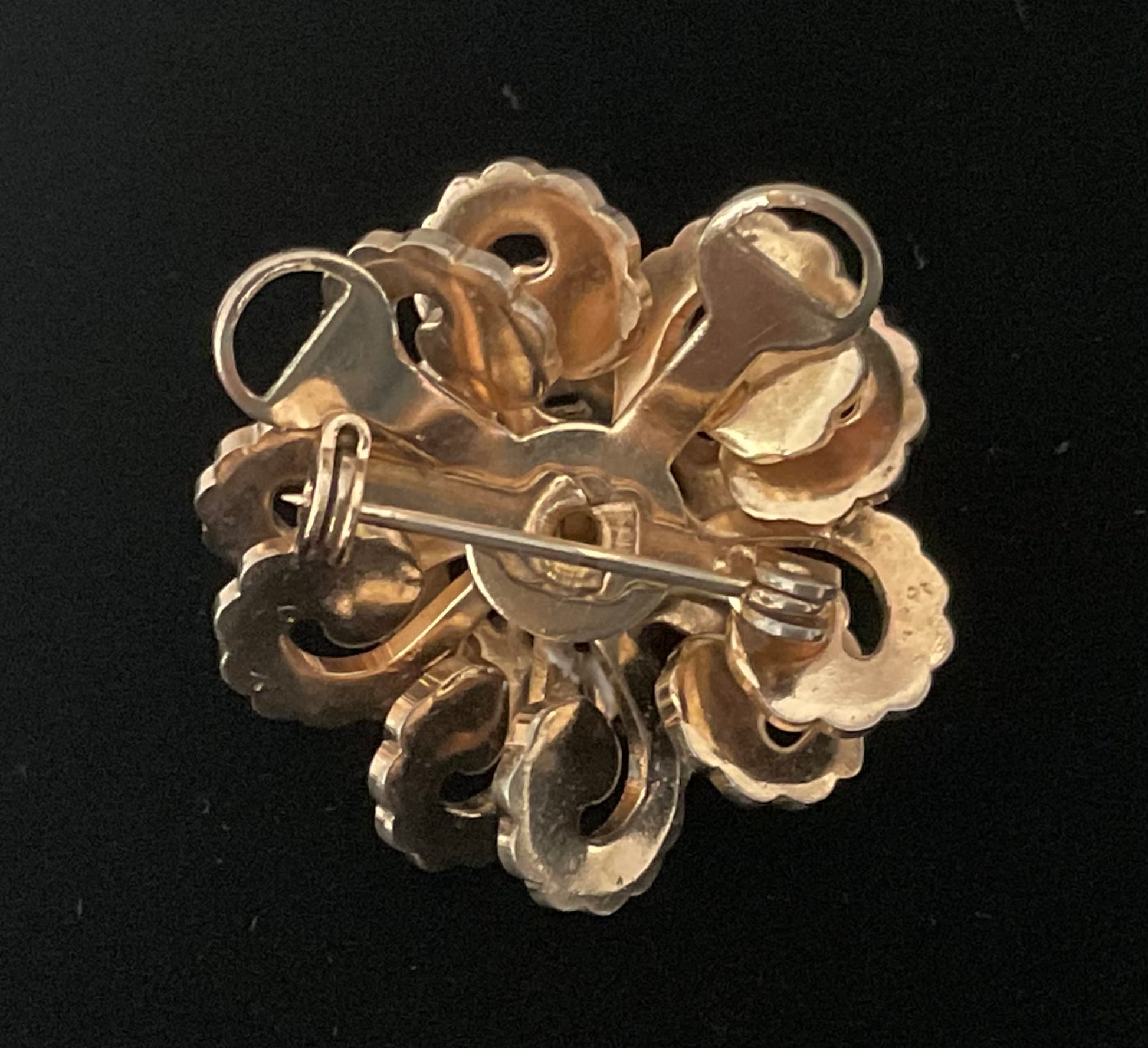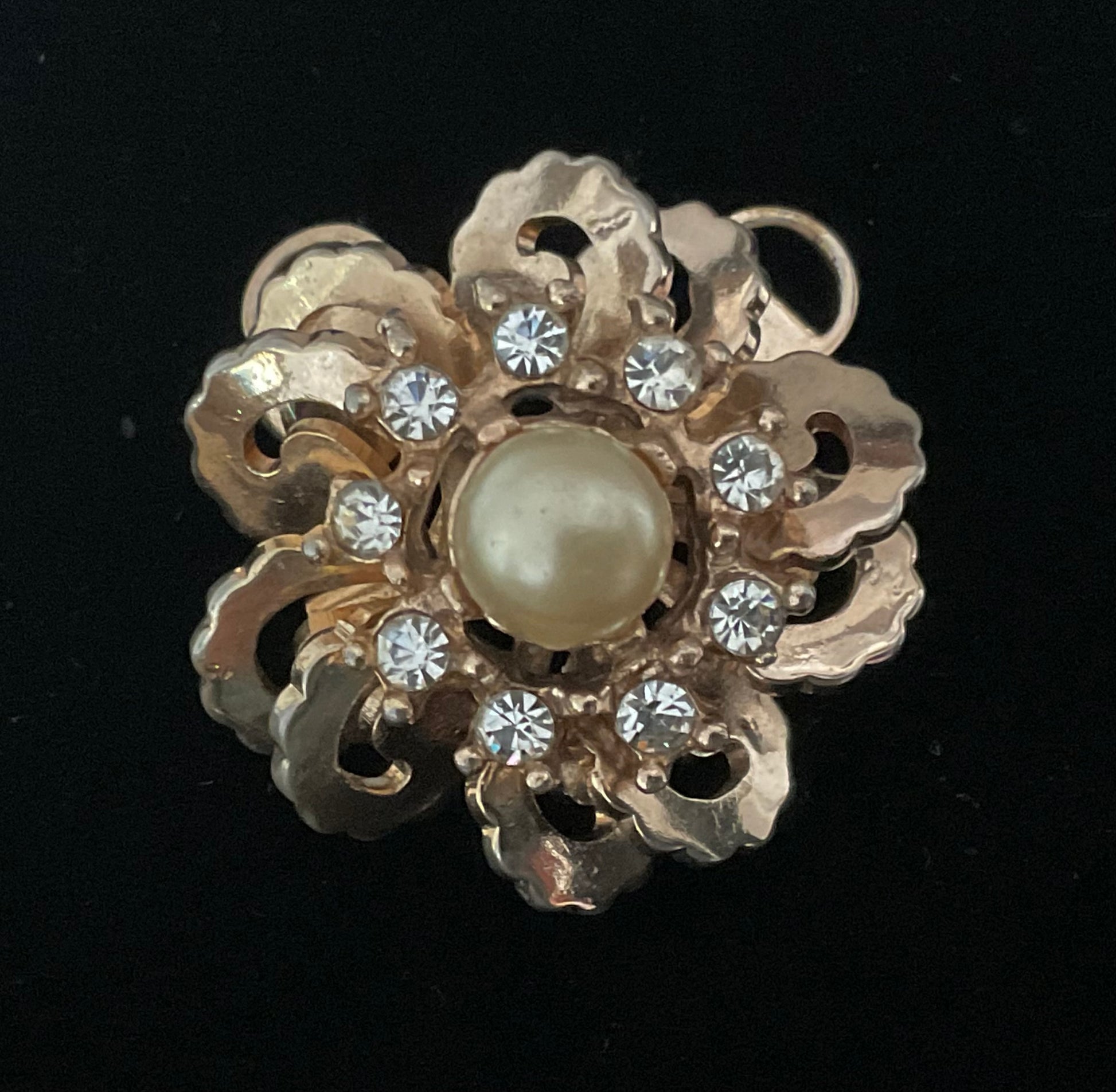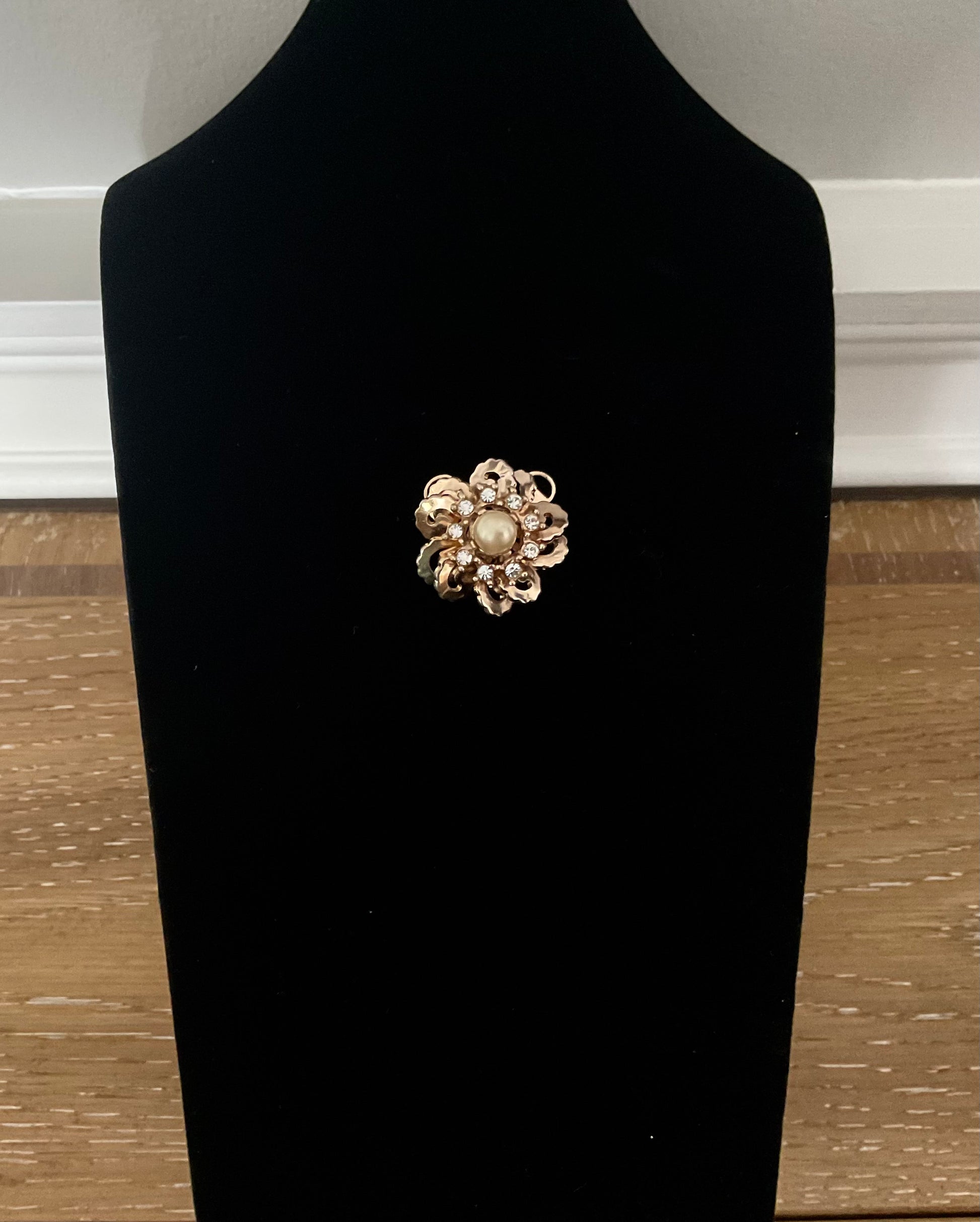 Small but mighty! This beautiful vintage pin can also be worn as pendant. Measuring 1 1/4”, it features nine sparkling rhinestones.