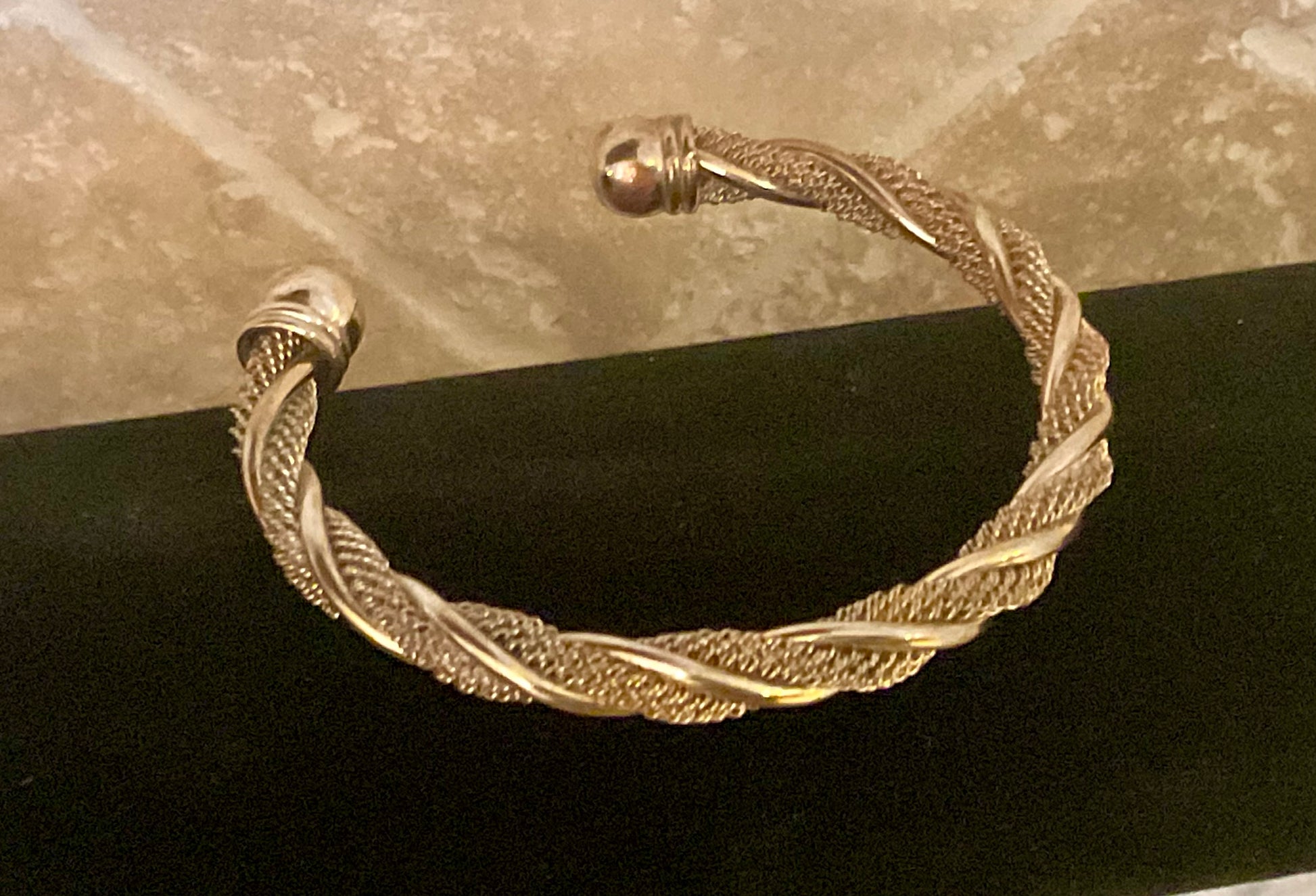 Smooth and riveted gold tone metals twist to make this bracelet an eyecatching piece. Fits small-average wrist.